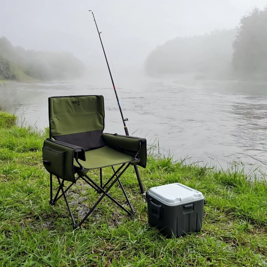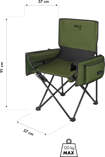 Praktische details waardeert u op elke stap: twee zijvakken voor kleine spullen en drankjes, een transporthoes voor eenvoudig dragen en een print met een schaal van 15" op de achterzijde van de rugleuning. Dankzij de opvouwbare constructie neemt hij weinig ruimte in en met een gewicht van circa 4,4 kg neemt u hem gemakkelijk overal mee naartoe.