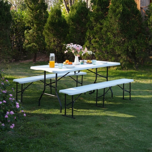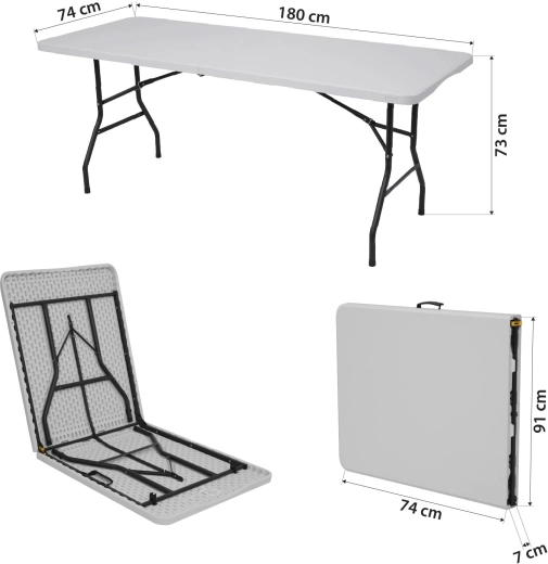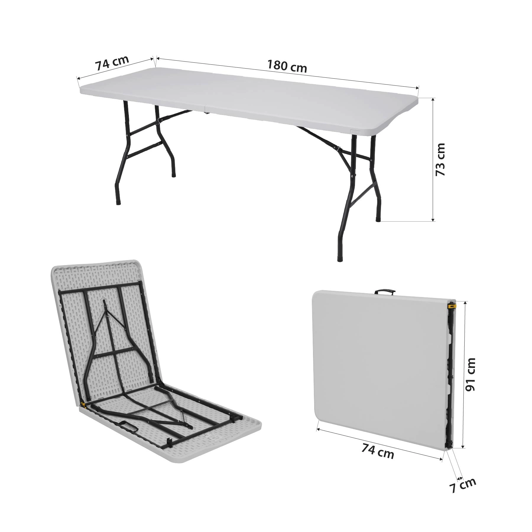 Het royale oppervlak van 180 × 74 cm biedt voldoende ruimte voor gasten, hapjes en uitrusting. De ergonomische hoogte van 73 cm is comfortabel om aan te zitten en om staand te werken. Het praktische vouwsysteem verandert de tafel in een compact “koffertje” met draaggreep, zodat je hem eenvoudig in de auto, kast of onder het bed kunt opbergen.