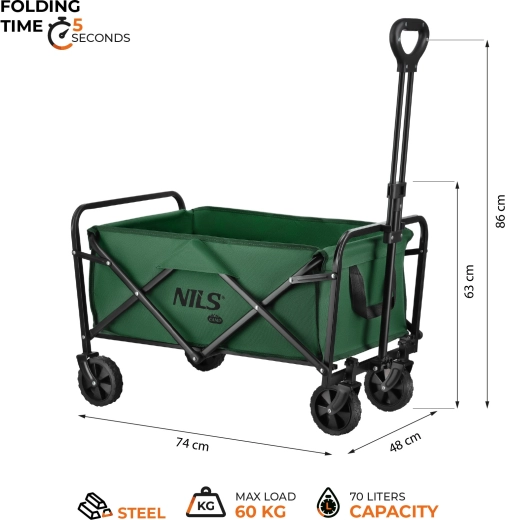 NILS Camp NC4306 is een veelzijdige opvouwbare wagen die tijd en moeite bespaart. Dankzij de capaciteit van 70 liter en de stabiele constructie vervoer je moeiteloos dekens, picknickspullen, sportuitrusting en zelfs grotere boodschappen. De verstelbare handgreep zorgt voor een natuurlijke grip voor verschillende lichaamslengtes.