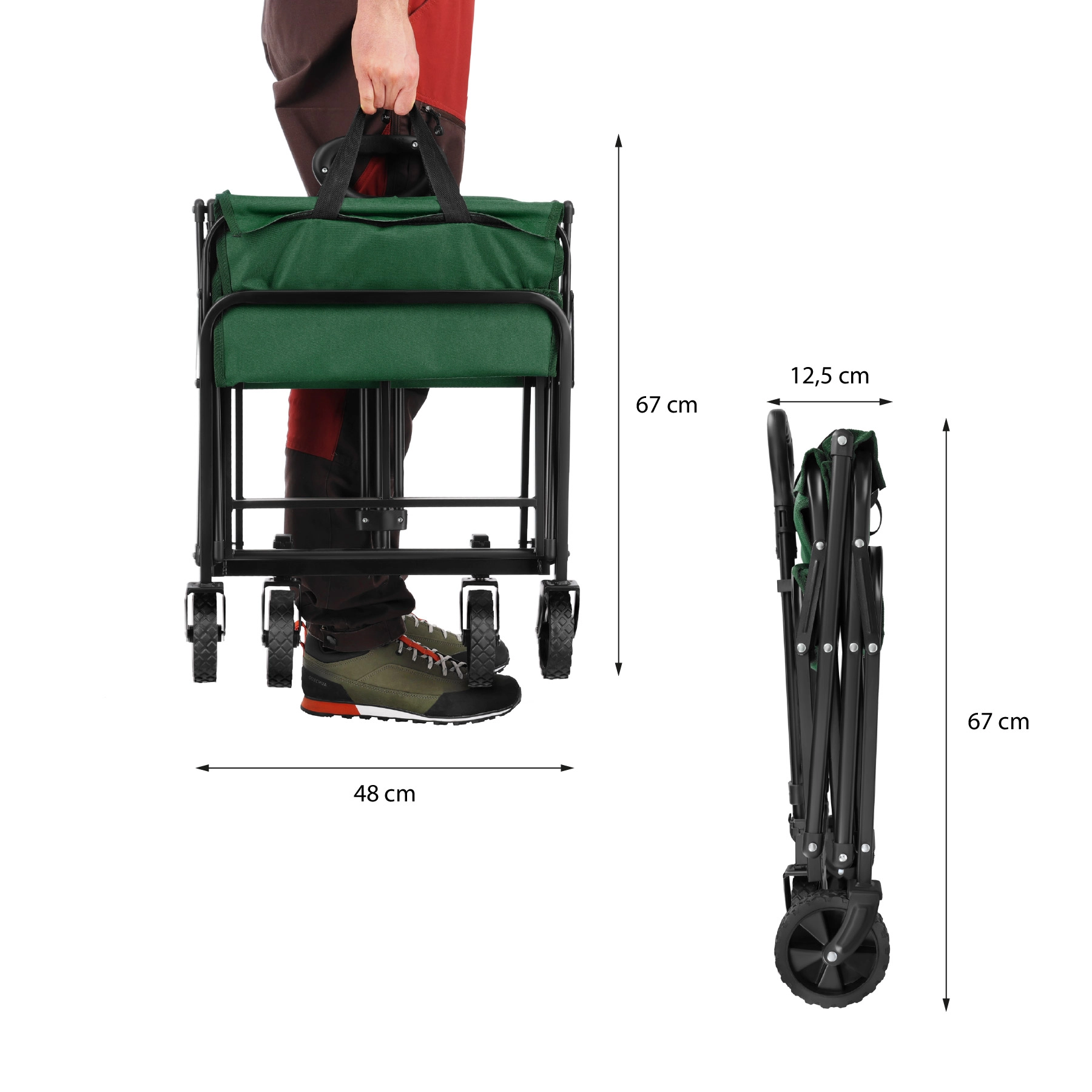 Het materiaal 600D Oxford met PVC is slijtvast en vuilafstotend, helpt de inhoud te beschermen tegen vocht en is ideaal voor gras, zand en wisselende weersomstandigheden. Na gebruik klap je de wagen in een oogwenk in – de compacte afmetingen passen gemakkelijk in de kofferbak van de auto of in een kast.