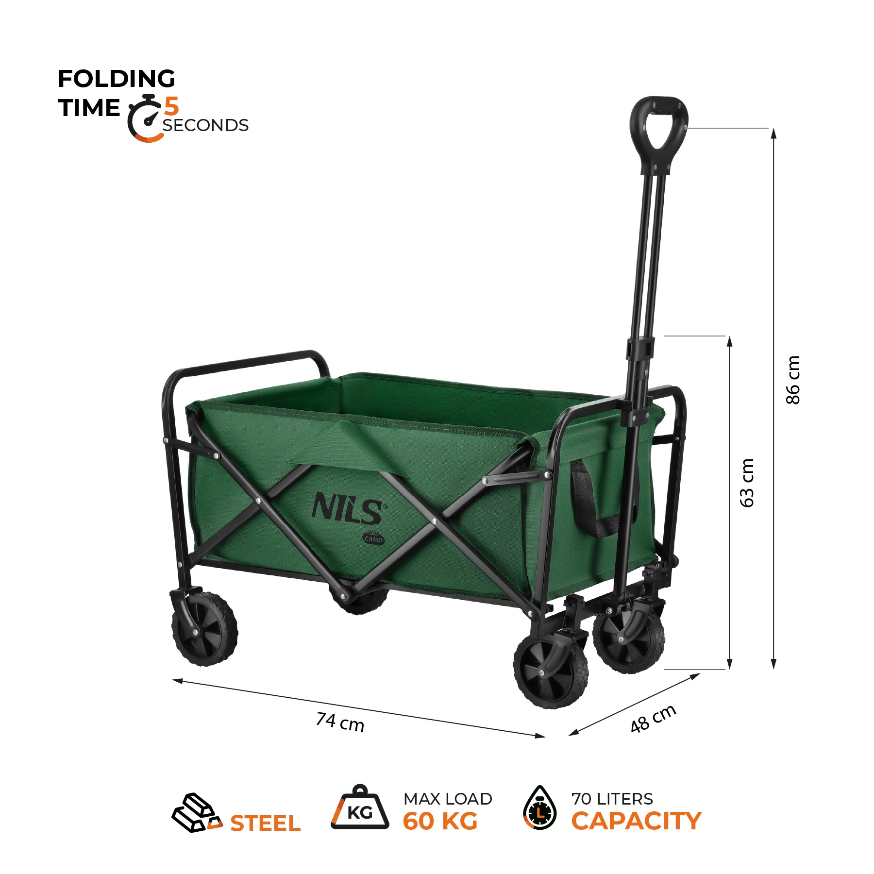 De lichte maar stevige opvouwbare wagen NILS Camp NC4306 maakt het vervoeren van uitrusting naar het strand, de camping en zelfs tijdens het winkelen eenvoudig. Hij biedt een inhoud van 70 l, een draagvermogen van 60 kg en een verstelbare handgreep voor comfortabel sturen. De duurzame 600D Oxford-stof met PVC en het snelle vouwsysteem garanderen praktisch gebruik en eenvoudig opbergen.