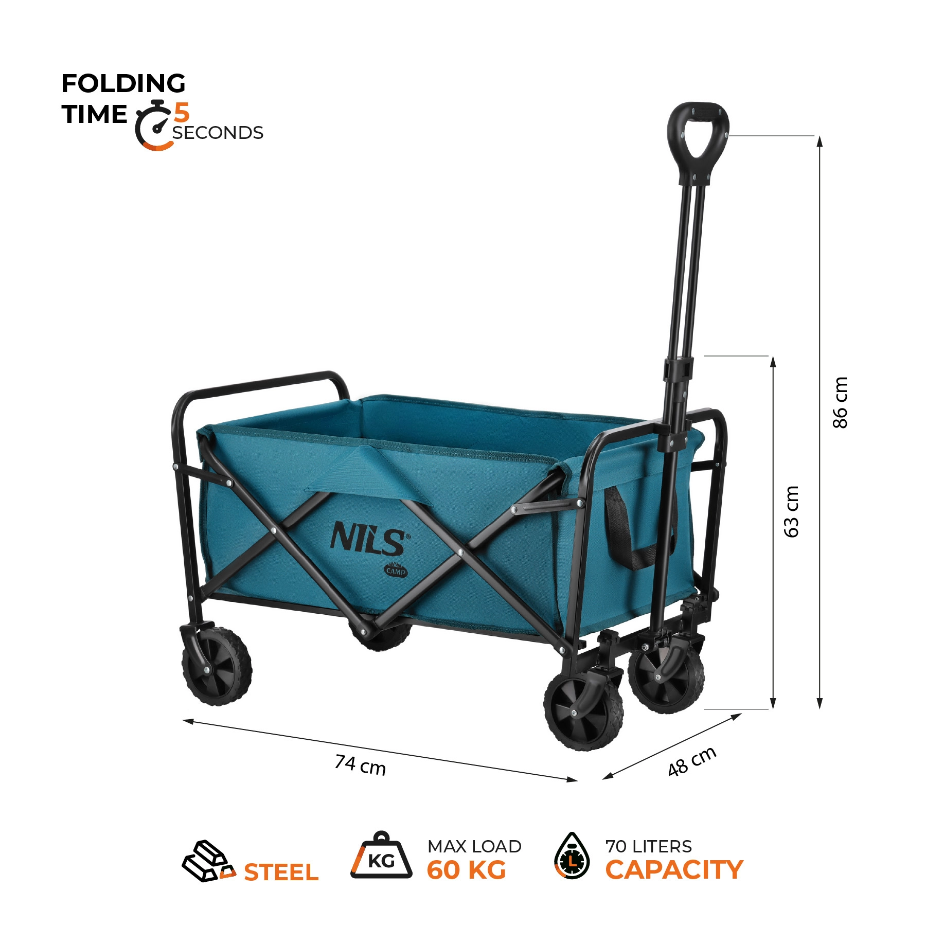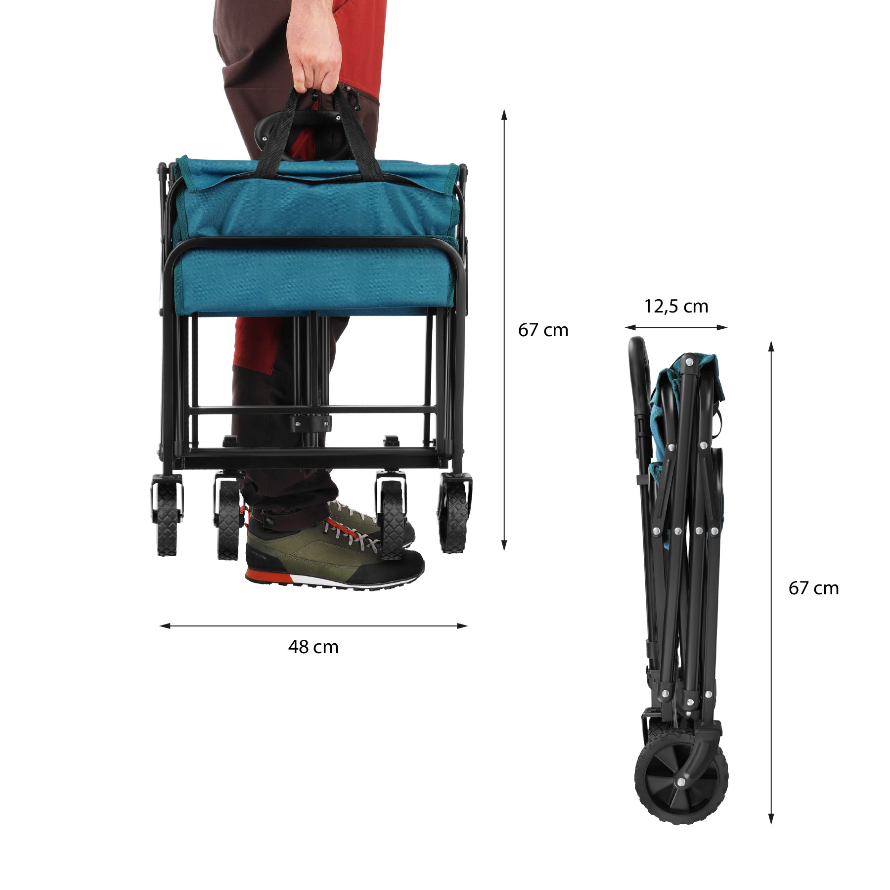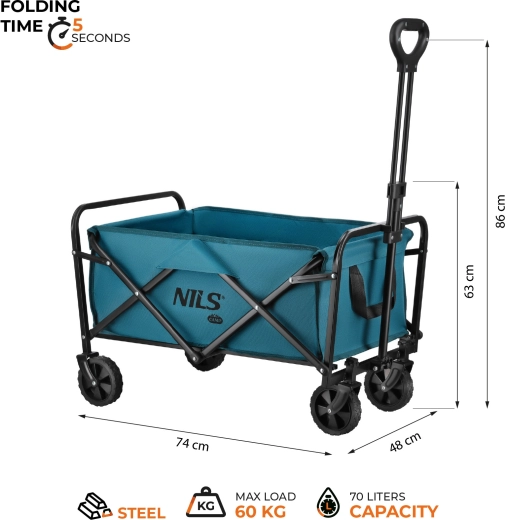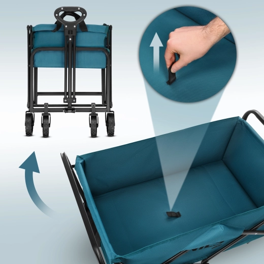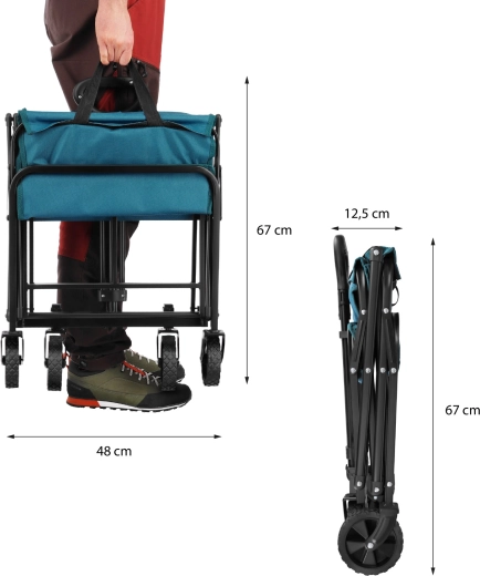 De praktische kampeerwagen in turkooiskleur is ideaal voor het strand, picknicks, kamperen en dagelijkse boodschappen. Dankzij het snelle vouwsysteem is hij in een oogwenk klaar voor gebruik en na afloop gemakkelijk op te bergen in de kofferbak of kast. Het stevige stalen frame met poedercoating en de duurzame 600D Oxford-stof met PVC zorgen voor een lange levensduur en bescherming van de vervoerde spullen.