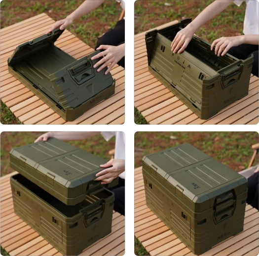 De box is ontworpen voor modulair stapelen – meerdere stuks plaatst u eenvoudig en stabiel op elkaar, zodat u de ruimte efficiënt benut. De interne inhoud van 42 liter biedt plaats aan kleding, sportuitrusting, kampeerspullen of autoaccessoires. Ingeklapt is hij slechts 15,5 cm hoog, waardoor hij gemakkelijk in smalle ruimtes past.