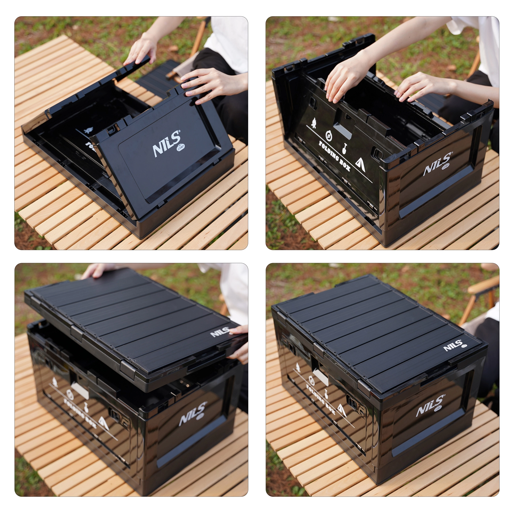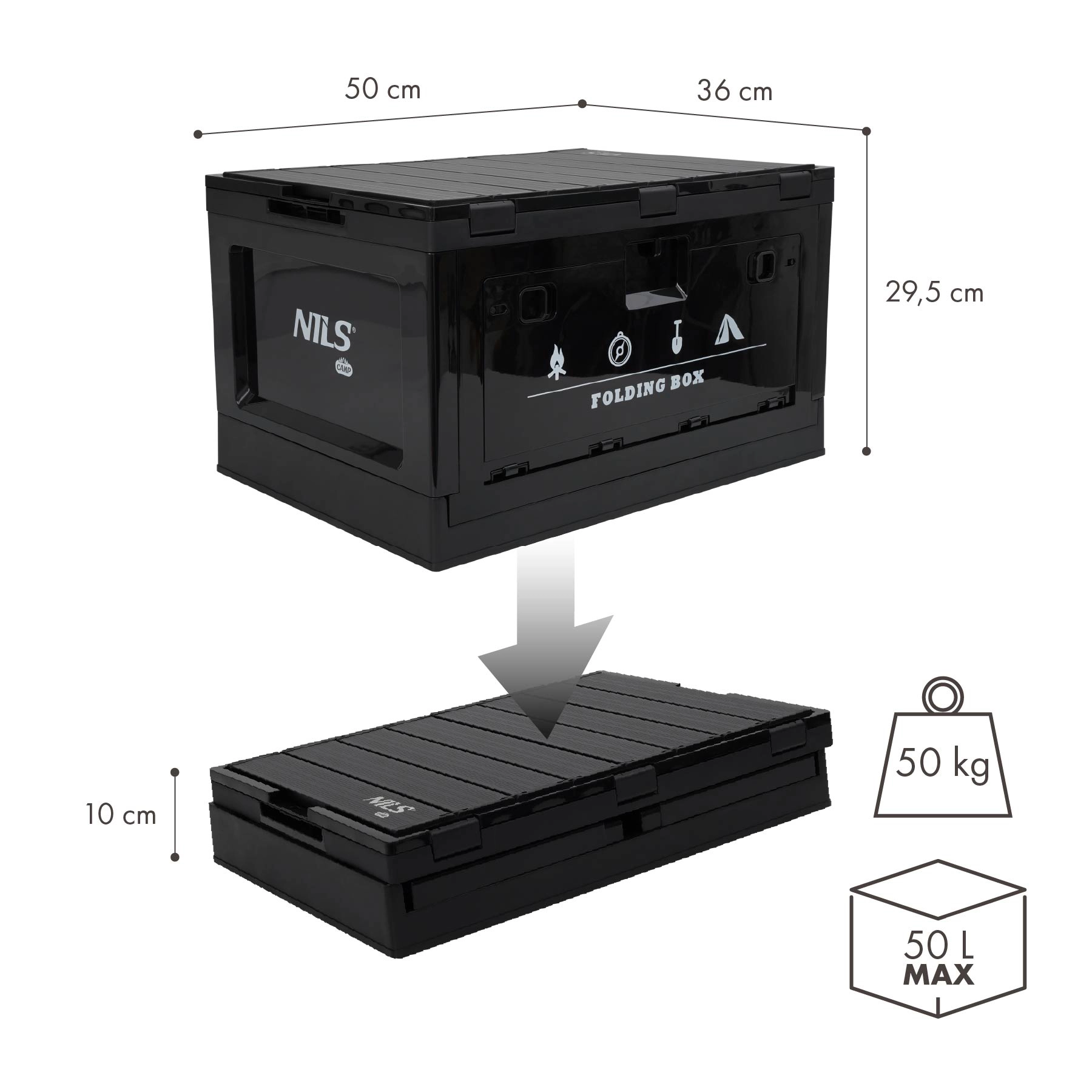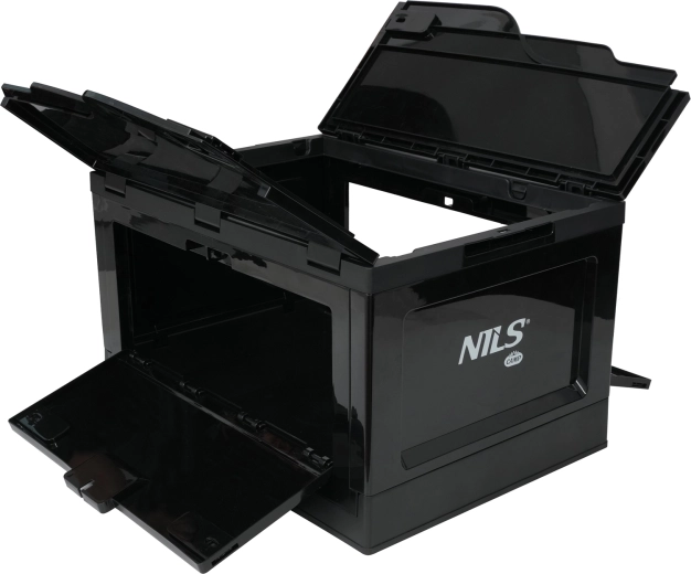 De robuuste en ruime opvouwbare box van NILS CAMP combineert slim opbergen met de functie van een werkoppervlak. Het geïntegreerde deksel dient als stabiel tafeltje voor het bereiden van maaltijden, werken met gereedschap of het organiseren van kleine spullen. Dankzij polypropyleen (PP) is hij bestand tegen vocht, mechanische belasting en wisselende weersomstandigheden.