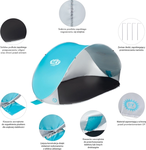 De tent gebruikt een stevige glasvezelstok en een duurzaam polyester doek met uv-bescherming die tot 96% van de schadelijke straling weerkaatst. Dankzij een waterkolom van 450 mm kan hij ook een lichte regenbui aan. Na een dag op het strand vouw je hem met één beweging op in de tas met een diameter van 80 cm.