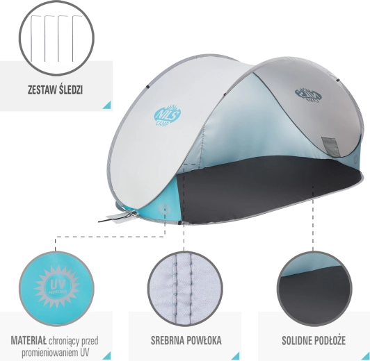 De zelfopvouwende strandtent NILS Camp grijs is de ideale keuze voor op het strand, bij het zwembad of aan het thuisbad. Dankzij de automatische uitklapfunctie is hij binnen enkele seconden klaar, terwijl het polyester doek met UV-coating tot 96% schadelijke UV-straling weerkaatst. De praktische ronde draagtas met handvat maakt vervoeren en opbergen eenvoudig.