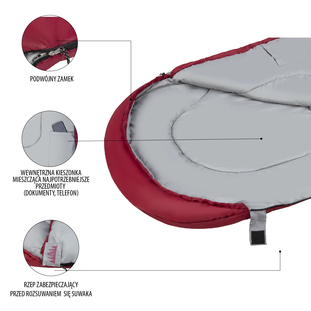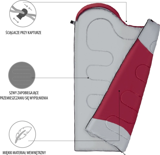 De tweezijdige rits met een brede klep met klittenband voorkomt ongewenst openen tijdens de slaap. Dankzij de lange rits aan de zijkant en onderzijde kun je de slaapzak eenvoudig openen tot een deken – ideaal voor warmere nachten. De verlengde lengte en de capuchon met trekkoord verhogen het comfort en de warmte. Inclusief een praktische compressiehoes met riemen, die na aantrekken tot een derde van het volume kan besparen.