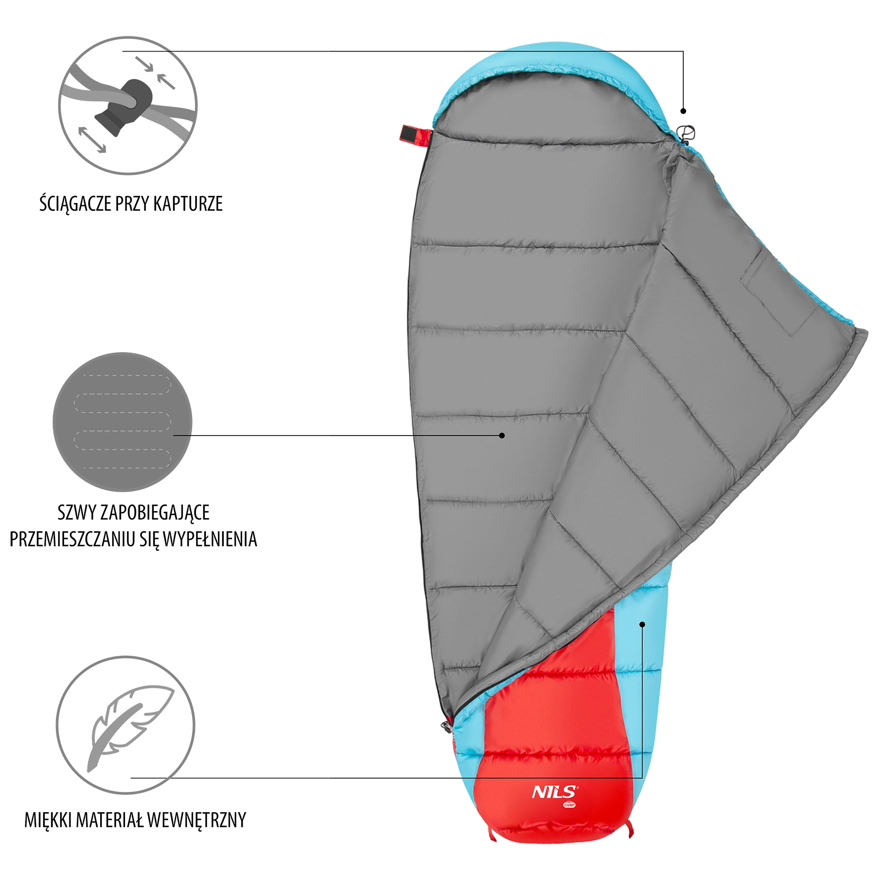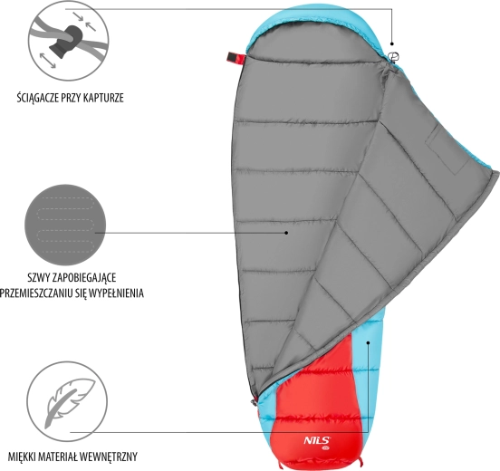 De mummieslaapzak NILS Camp NC2012 is een betrouwbare keuze voor kamperen, trekkings en een nachtje in de tuin. De “mummie”-constructie verkleint het te verwarmen volume en laat na het aantrekken van de capuchon slechts een kleine opening voor het gezicht, waardoor hij warmte efficiënt vasthoudt. De buitenkant van 190T polyester W/R Cire en de binnenkant van 190T Pongee voelen prettig aan en zijn tegelijk bestand tegen vocht.