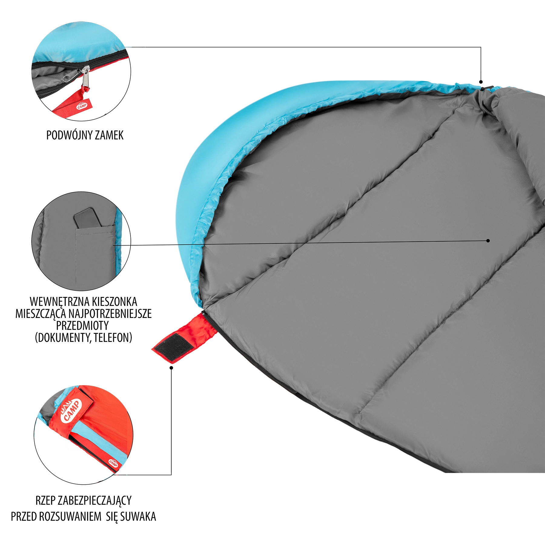 De isolerende holvezelvulling van 300 g/m² en de doorlopende stiknaden zorgen voor egale isolatie zonder verschuiven. De tweewegsrits is afgedekt met een isolerende tochtstrook en extra geborgd met een brede manchet met klittenband, zodat hij tijdens het slapen niet opengaat. Inclusief compressiezak met banden die het volume na aantrekken met ongeveer een derde verkleint.