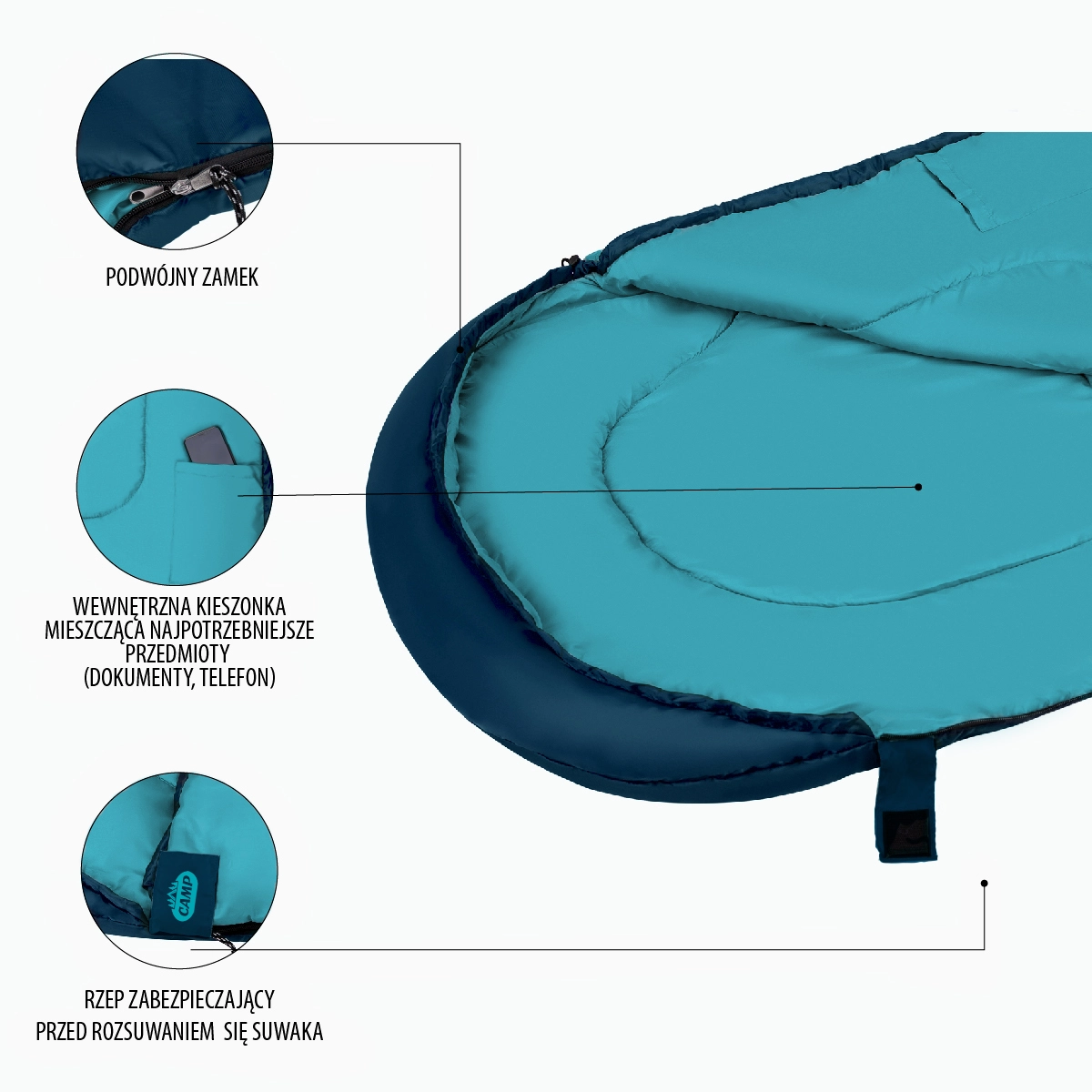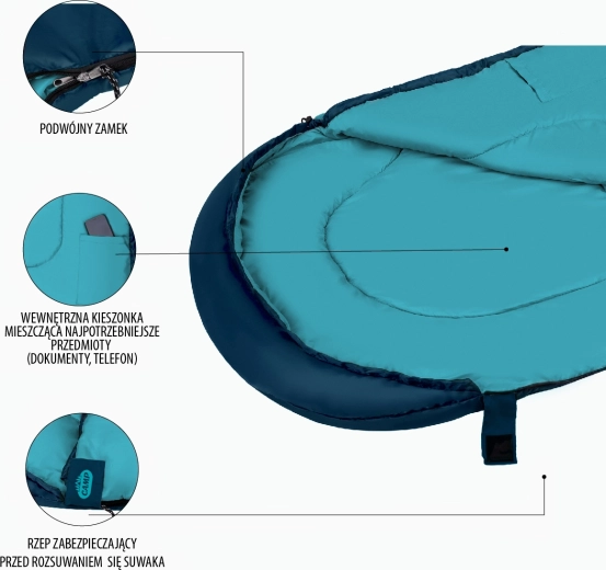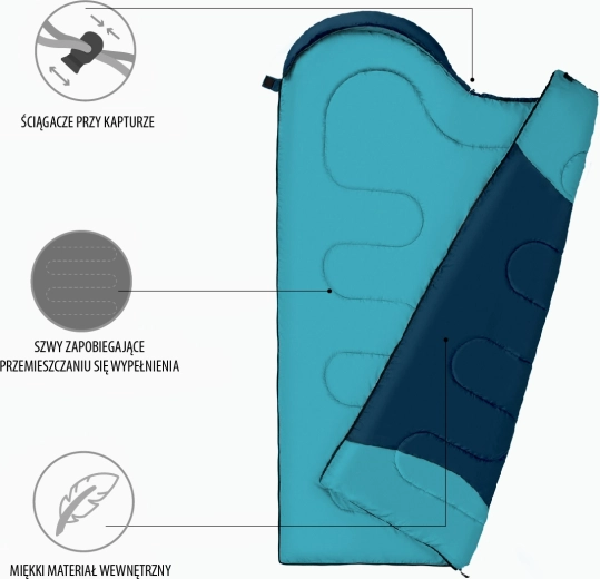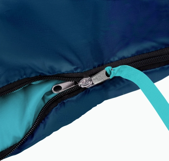 De tweerichtingsrits aan de zijkant en onderkant maakt volledig openen tot deken mogelijk – ideaal voor warmere periodes. Een brede manchet met klittenband voorkomt betrouwbaar ongewenst openen tijdens het slapen. De capuchon met aantrekkoord en koordstopper minimaliseert warmteverlies, terwijl de verlengde constructie meer ruimte en comfort biedt.