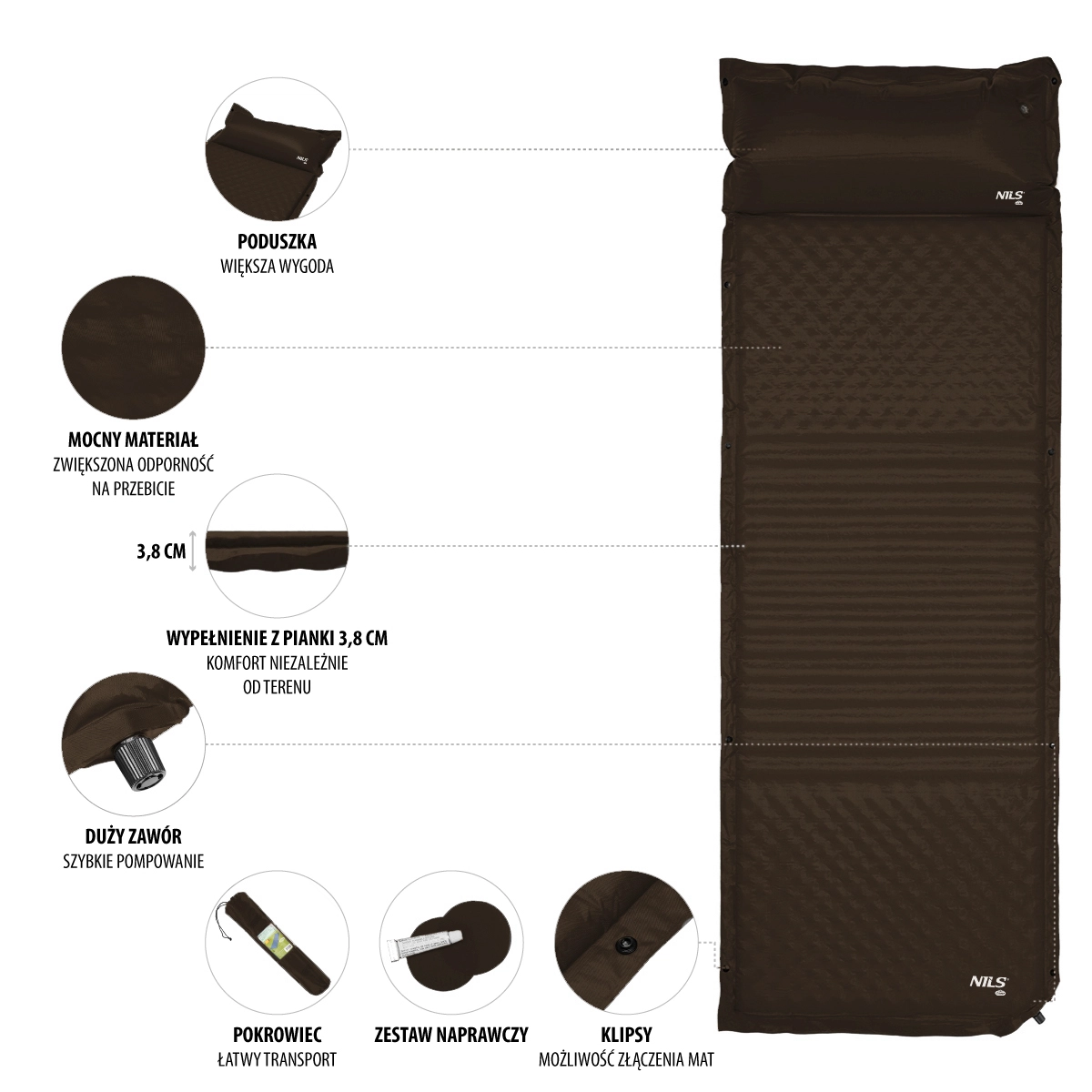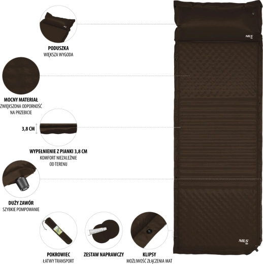 - Comfort en praktisch gebruik: zelfopblazend systeem, geïntegreerd kussentje, eenvoudig in te pakken in de draagzak.