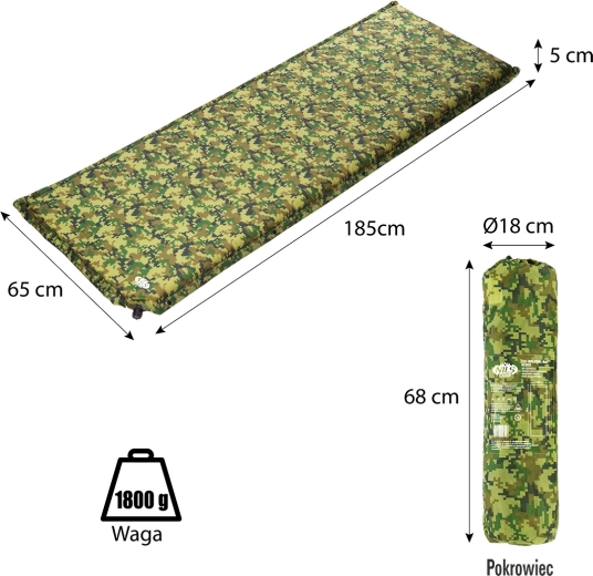 Licht en compact zelfopblazend slaapmatje van NILS Camp in camouflage-uitvoering voor een comfortabele nachtrust tijdens kamperen, trektochten en festivals. Dankzij het zelfopblazende systeem hoef je alleen het ventiel te openen en is het in een mum van tijd klaar voor gebruik. Het biedt een laag gewicht van 1,5 kg, gemakkelijk in te pakken in een praktische hoes en afmetingen die ideaal zijn voor ontspannen rust.