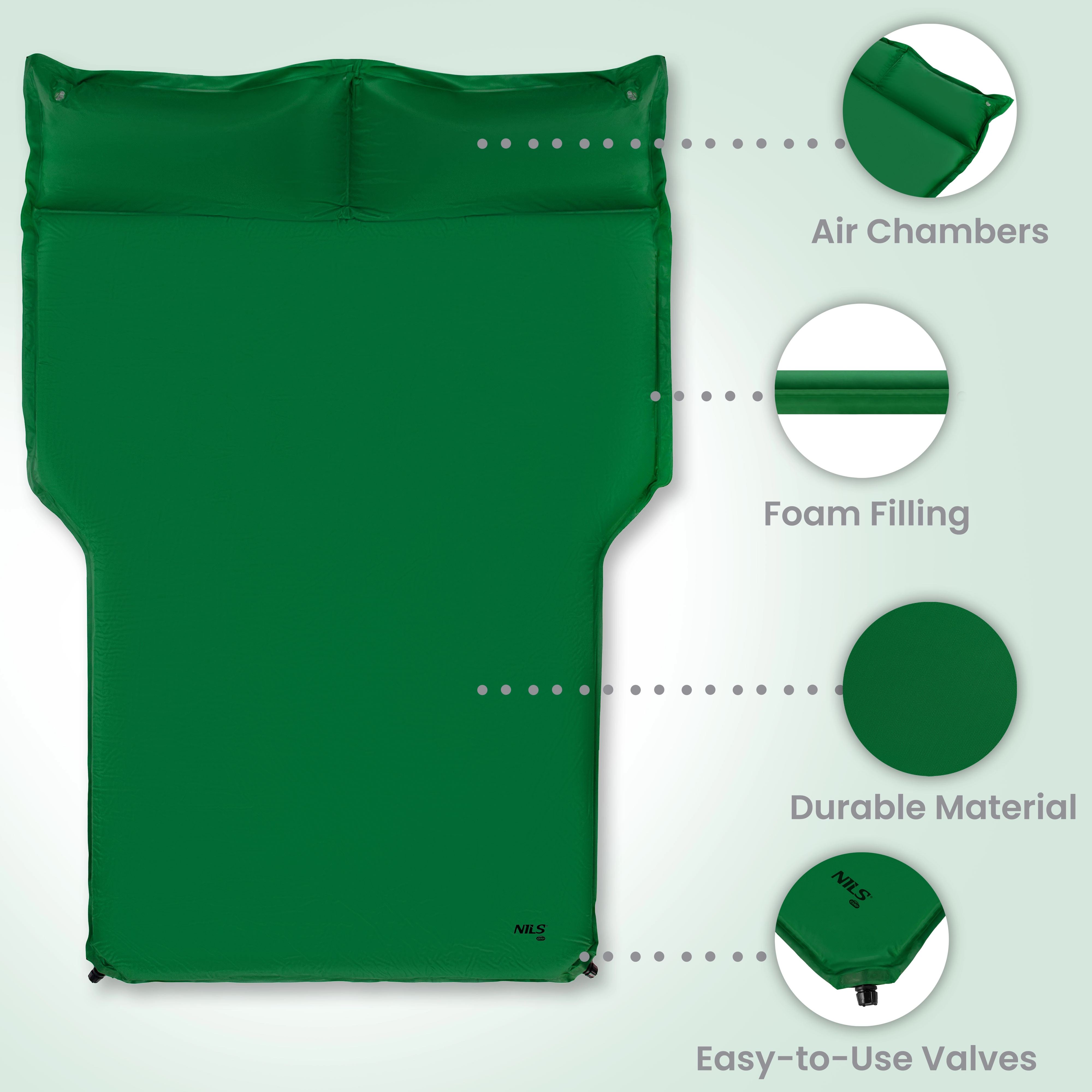 Geniet van een rustige slaap onderweg. De zelfopblazende automat van NILS Camp is zo ontworpen dat hij perfect in de bagageruimte past en een vlak, comfortabel en goed geïsoleerd oppervlak creëert. Geïntegreerde kussentjes onder het hoofd verhogen het comfort en besparen ruimte in je bagage.