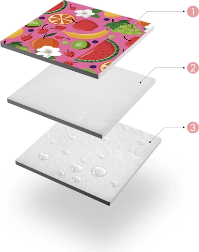 Bovenlaag van fleece voor zacht zitten, 2 mm schuim voor comfort en een PE-onderzijde met aluminium voor bescherming tegen kou en vocht – ideaal ook op koelere of natte ondergronden.