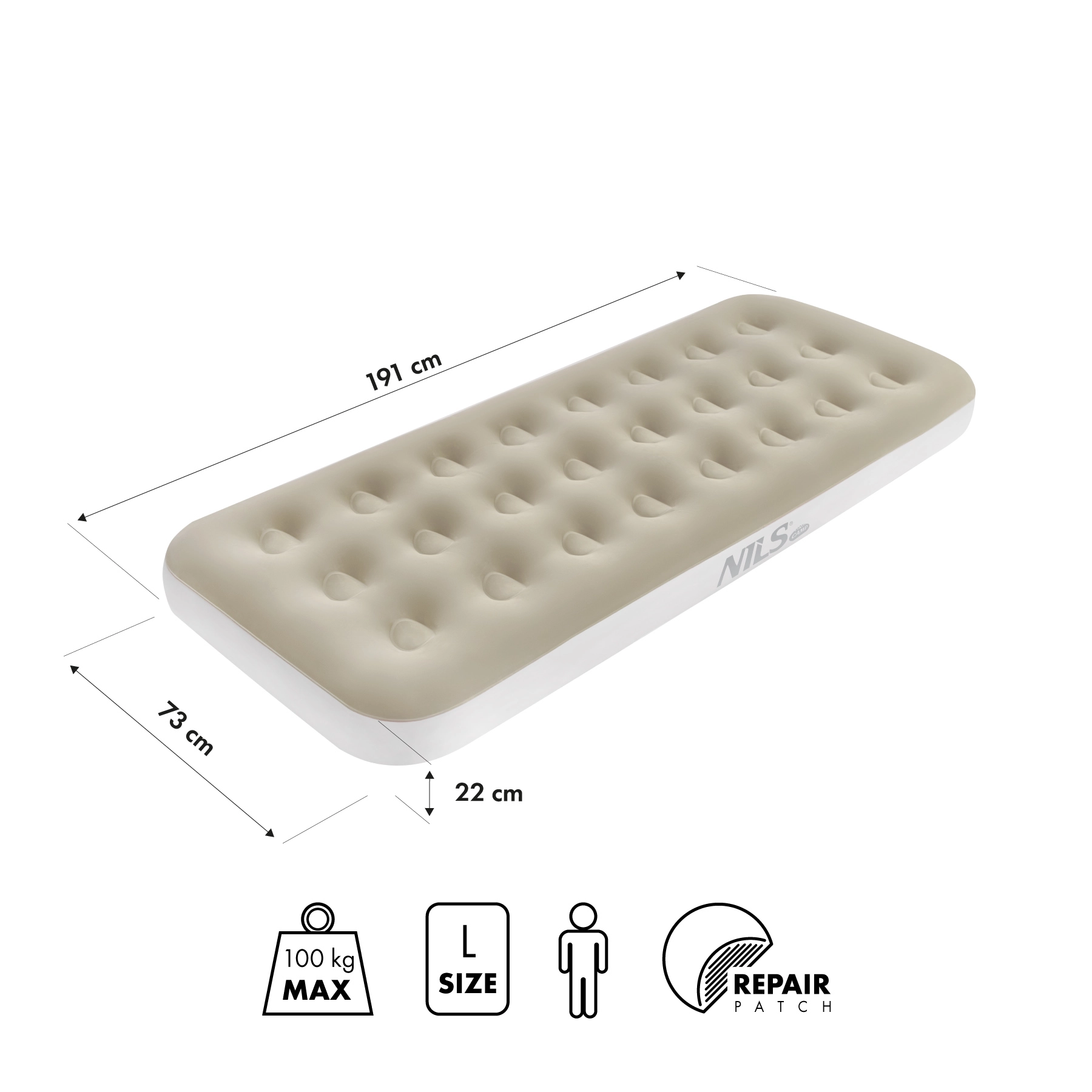 De afmetingen 191 × 73 × 22 cm en het draagvermogen van 120 kg maken het matras tot een uitstekende keuze voor kamperen, de tuin en als extra bed thuis.