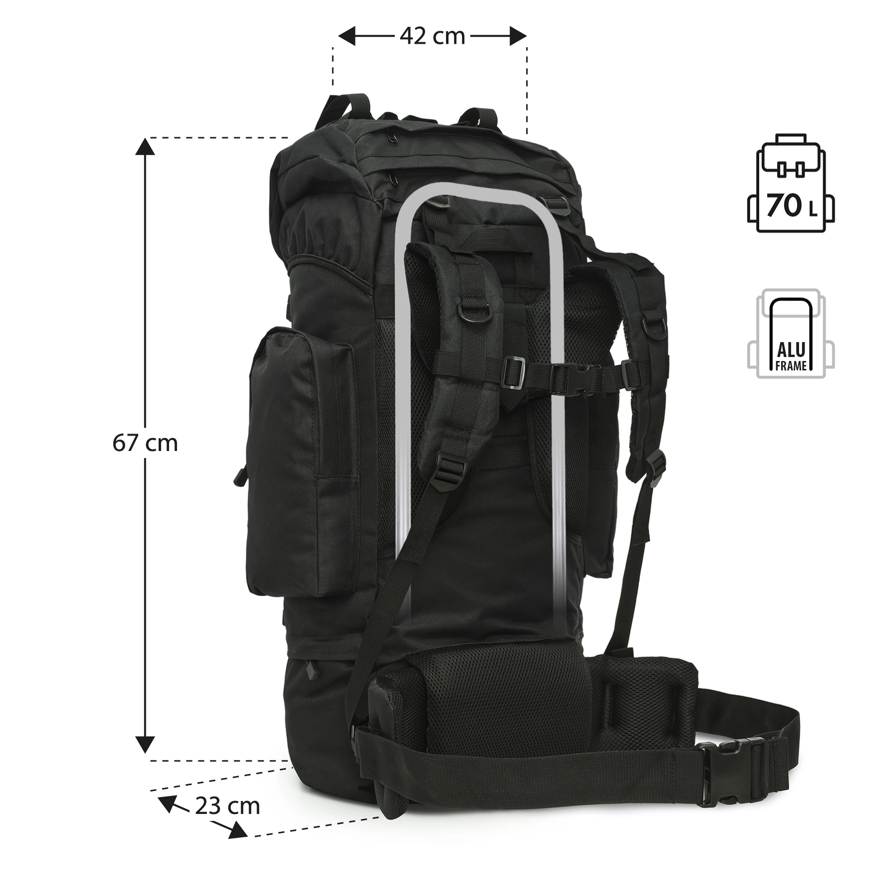 Zoek je een betrouwbare rugzak voor een meerdaagse trektocht, bushcraft of survival? De NILS Camp Eagle 70 l combineert een groot volume met doordachte uitrusting. Slijtvaste 100% polyester met PVC-coating en het stevige maar lichte aluminium frame zorgen voor stabiliteit van de lading en een lange levensduur, ook in ruw terrein. Ergonomisch gevormde rug in combinatie met verstelbare schouderbanden helpt het gewicht te verdelen en verhoogt het comfort tijdens lange tochten.