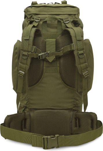 Dankzij het slijtvaste polyester met PVC-coating en het uitneembare aluminium frame kan de rugzak intensief gebruik aan en helpt hij bovendien het gewicht gelijkmatig te verdelen over de rug. Anatomisch gevormde rug samen met een verstelbare borst- en heupband verhogen de stabiliteit en verlagen de druk op de schouders tijdens lange tochten. De praktische regenhoes beschermt je uitrusting tegen regen en modder.