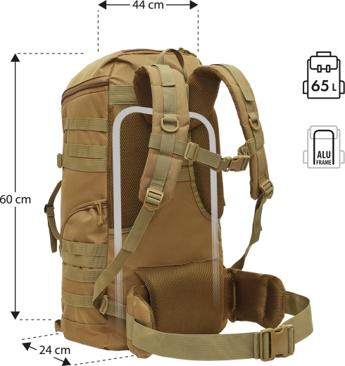 De robuuste toeristenrugzak NILS Camp Maverick met een inhoud van 65 l is ontworpen voor lange tochten, kamperen en survival. Biedt een duurzame constructie, snelle toegang dankzij volledige opening, een aluminium frame voor stabiliteit en een laag gewicht van 1,4 kg voor comfortabel dragen.