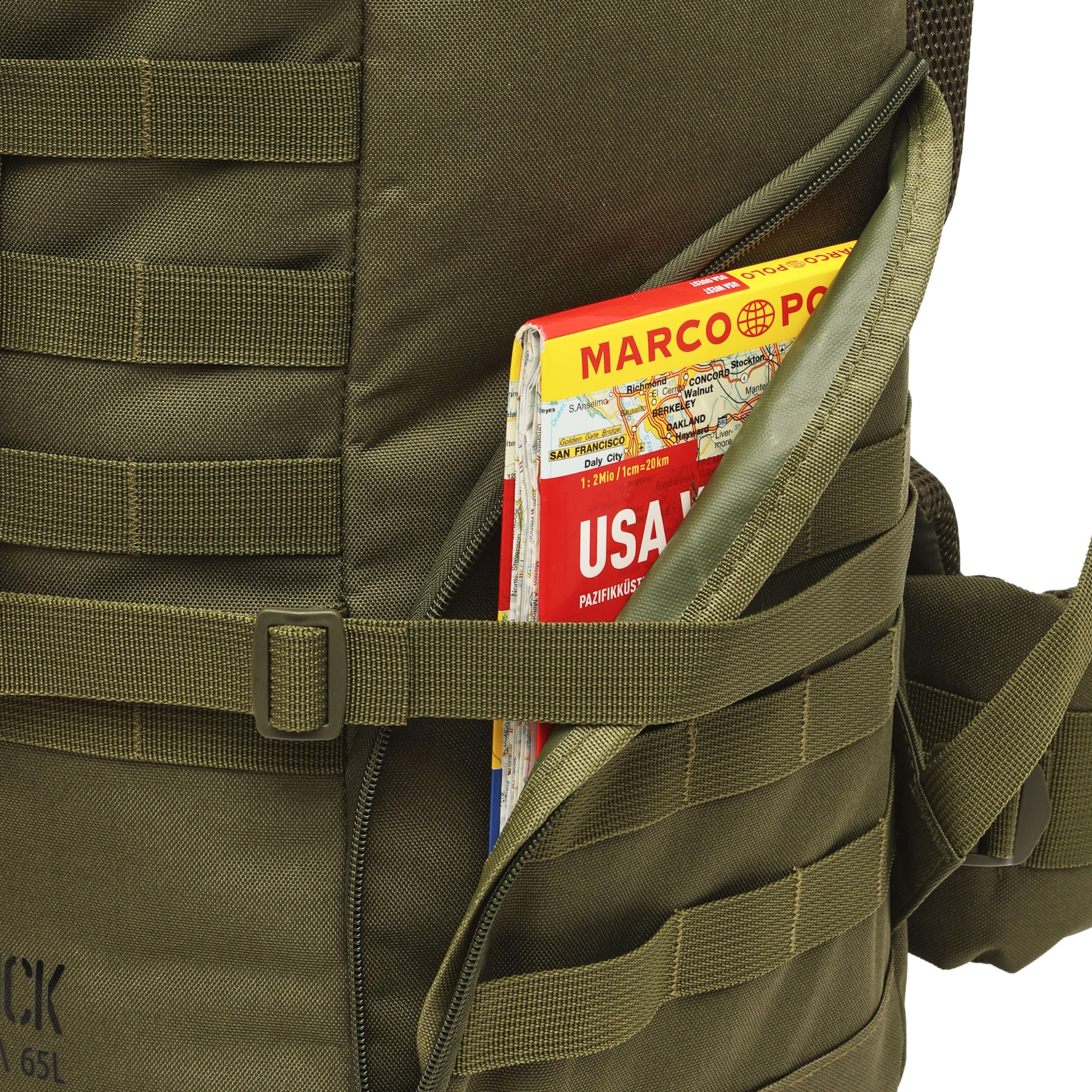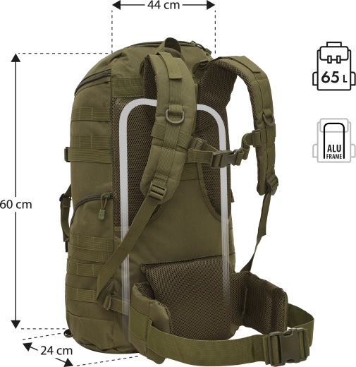 Voor liefhebbers van de tactische stijl is er de mogelijkheid tot personalisatie met klittenband (patches niet inbegrepen). Met een gewicht van slechts 1,4 kg en een inhoud van 65 l is dit een betrouwbare rugzak voor meerdaagse tochten en intensieve outdooractiviteiten.