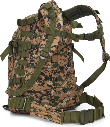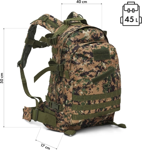 Deze camouflage rugzak combineert functionaliteit, laag gewicht en een tactisch design. Het materiaal van duurzaam polyester met een PVC-coating en een interne 210D voering beschermt de inhoud tegen slijtage en vocht, terwijl het lage gewicht van slechts 1 kg zorgt voor comfortabel dagelijks gebruik.
