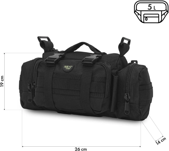 NILS Camp NC3907 is een XL-heuptasje met een tactisch karakter, dat compacte afmetingen combineert met verrassend veel opbergruimte. De inhoud van 5 liter biedt plaats aan een telefoon, portemonnee, sleutels, documenten, multitool, powerbank en andere essentials. Dankzij de afmetingen 26 × 19 × 14 cm belemmert het niet tijdens het bewegen en pas je het eenvoudig aan jouw draagstijl aan – als heuptas of crossbody over de schouder.