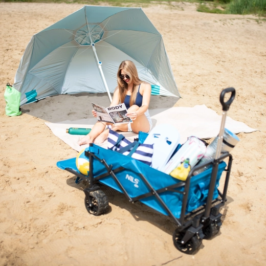 De praktische constructie met stalen stok en een punt om in de grond te steken maakt de installatie in zand en zachte bodem eenvoudig. In de transporttas met schouderriem is de parasol gemakkelijk mee te nemen en neemt hij weinig ruimte in – opgevouwen meet hij slechts 125 × 8 cm en weegt hij 1,6 kg.