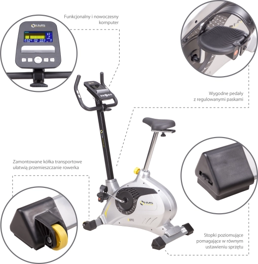 Verstelling van het zadel verticaal (9 standen) en horizontaal, verstelbaar stuur en een robuust stalen frame met 120 kg draagvermogen. Nivellerende stelvoeten en wielen vergemakkelijken verplaatsen en uitlijnen.