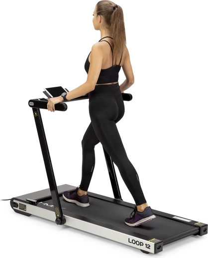 De HMS LOOP 12 combineert prestaties met ruimtebesparing. Met een topsnelheid van 12 km/u en een piekvermogen van 2,5 HP levert hij een soepele werking voor wandelen en lichte hardlooptraining. Het loopvlak van 125 × 45 cm is op 6 punten geveerd met silikagel-silentblocks die de gewrichten ontzien en het comfort bij elke stap verhogen.