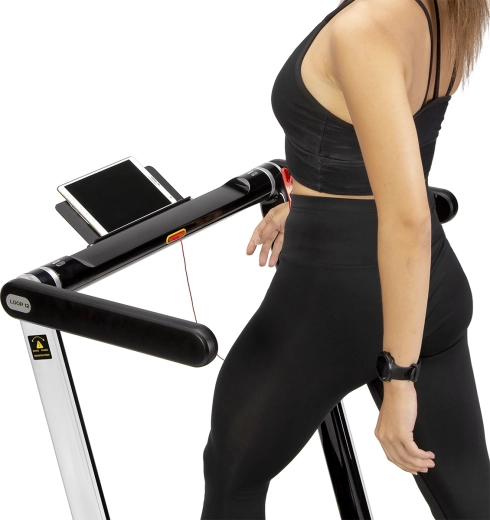 Het loopvlak van 125 × 45 cm met 6-punts demping vermindert de belasting op de gewrichten. Met veiligheidssleutel, handgrepen en quick-select snelheden 3/5 km/u.