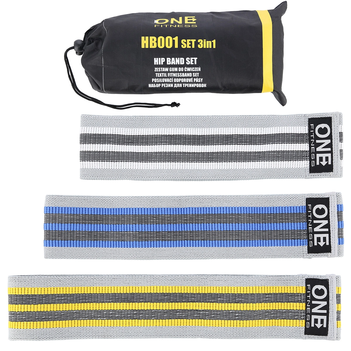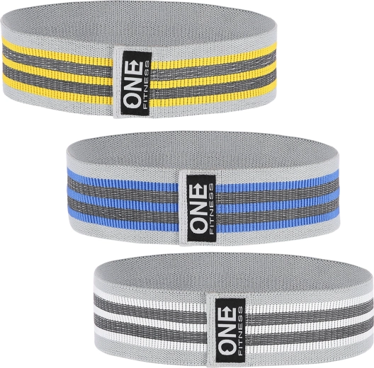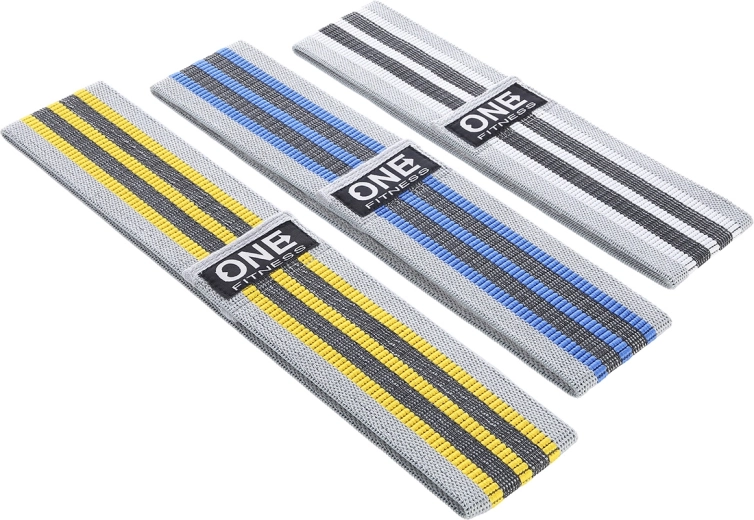 Complete set van drie textiele weerstandsbanden van het type Hip Band van het merk ONE Fitness voor effectieve training van de billen en de onderbenen. Duurzame banden van een combinatie van polyester en latex glijden niet, scheuren niet en bieden verschillende weerstandsniveaus voor activatie, krachttraining en revalidatie. Ideaal voor warming-up, squats, lunges en side steps, thuis en in de sportschool – met een praktische zak voor gemakkelijk meenemen.