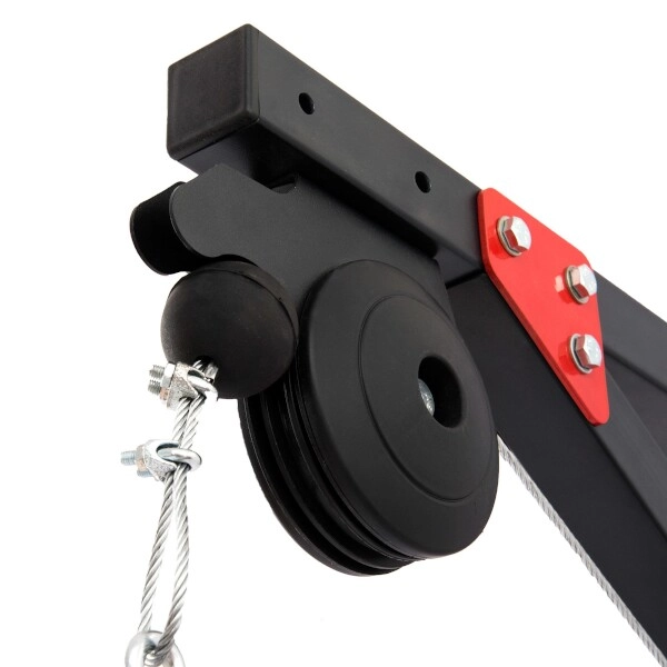 De set bevat ook een brede greep (MH-C001), een staalkabel en twee karabiners – veranker hem aan de muur en je kunt trainen met lat pull-downs, kabelstrekken, triceps-pressdowns en andere trekbewegingen. De rubberen kabelstop beschermt zowel het frame als de katrollen en absorbeert energie bij het snel loslaten van de greep.