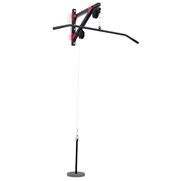 In de verpakking vind je een staalkabel, twee karabiners en een brede greep MH-C001. Alleen nog aan de muur verankeren en je kunt starten met lat pulldowns, triceps-pressdowns en andere trekkende oefeningen.