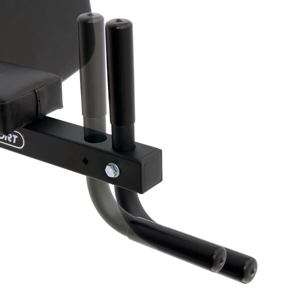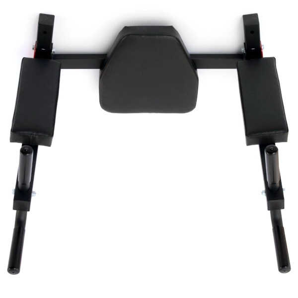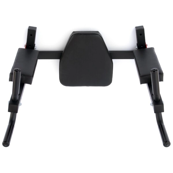 De greepbreedte is eenvoudig in te stellen op 43 of 47 cm met één enkele schroef – zo krijg je in een paar seconden de ideale ergonomie voor dips en knieën optrekken. Montage aan de muur gebeurt met vier schroeven (niet inbegrepen); kies geschikte bevestiging afhankelijk van het muurmateriaal.