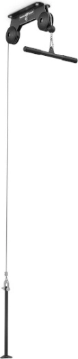 Een tricepsaccessoire is inbegrepen, waarmee je je training uitbreidt met triceps pushdowns, rows of bicepstrekoefeningen. Een rubberen stop aan het kabeluiteinde beschermt de constructie bij plotseling loslaten. Montage aan het plafond bespaart ruimte en maakt vloeiende uitvoering mogelijk van oefeningen zoals lat pulldown, triceps pushdown of seated rows met je favoriete greep.