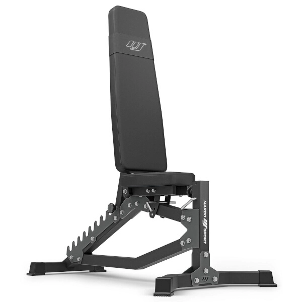 Robuuste en zeer stabiele, variabele fitnessbank MARBO Sport MS-L102 2.0 met 10 standen voor de rugleuning en 3 standen voor de zitting biedt nauwkeurige afstelling voor elke oefening. Dankzij het stalen frame 50 × 50 × 2 mm, een draagvermogen van 300 kg en comfortabel kussen met dubbele stiksels is hij ideaal voor intensieve training thuis, inclusief gebruik met een halterrek.