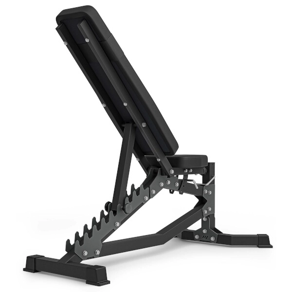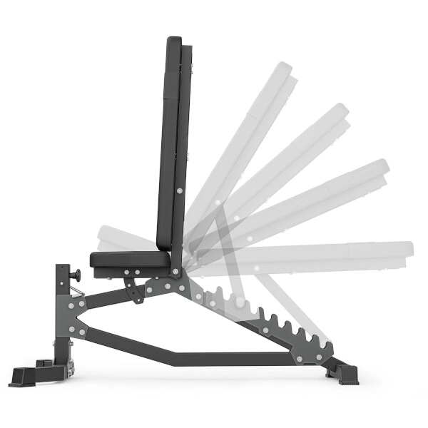 Het laddersysteem met laser-gesneden stopbeugels maakt 10 exacte posities mogelijk, inclusief een negatieve helling van -21°, zodat je de hoek voor bankdrukken, rows en zittende bicepsoefeningen eenvoudig kunt aanpassen.