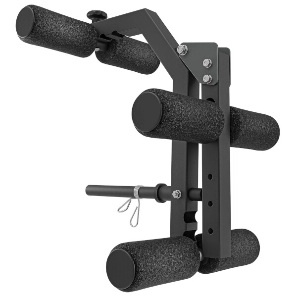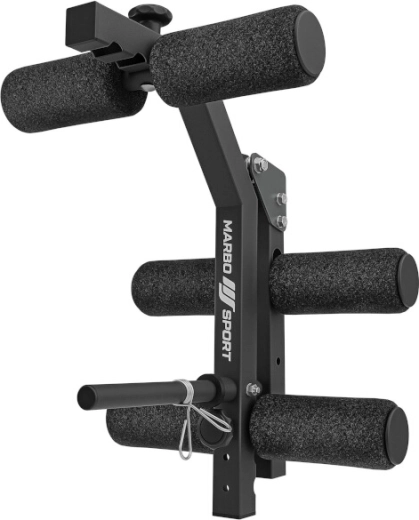 Voor maximaal comfort zijn alle contactpunten voorzien van EVA-schuimrollen die hun vorm behouden, zelfs bij intensieve training. De bovenste en onderste voetstops stel je in op 3 posities met een ergonomische schroef, de schuimrollen onder de knieën hebben 2 niveaus en de adapter zelf is in hoogte verstelbaar in 3 posities – zo pas je eenvoudig zowel het bewegingsbereik als de techniek aan. De laadpen met een lengte van 21 cm en een diameter van 25 mm is compatibel met gangbare schijven tot een diameter van 36 cm.