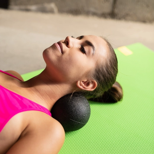 Plaats de bal onder het achterhoofd en maak met een zachte beweging spierknopen los. Ideaal bij langdurig zitten en na de training.