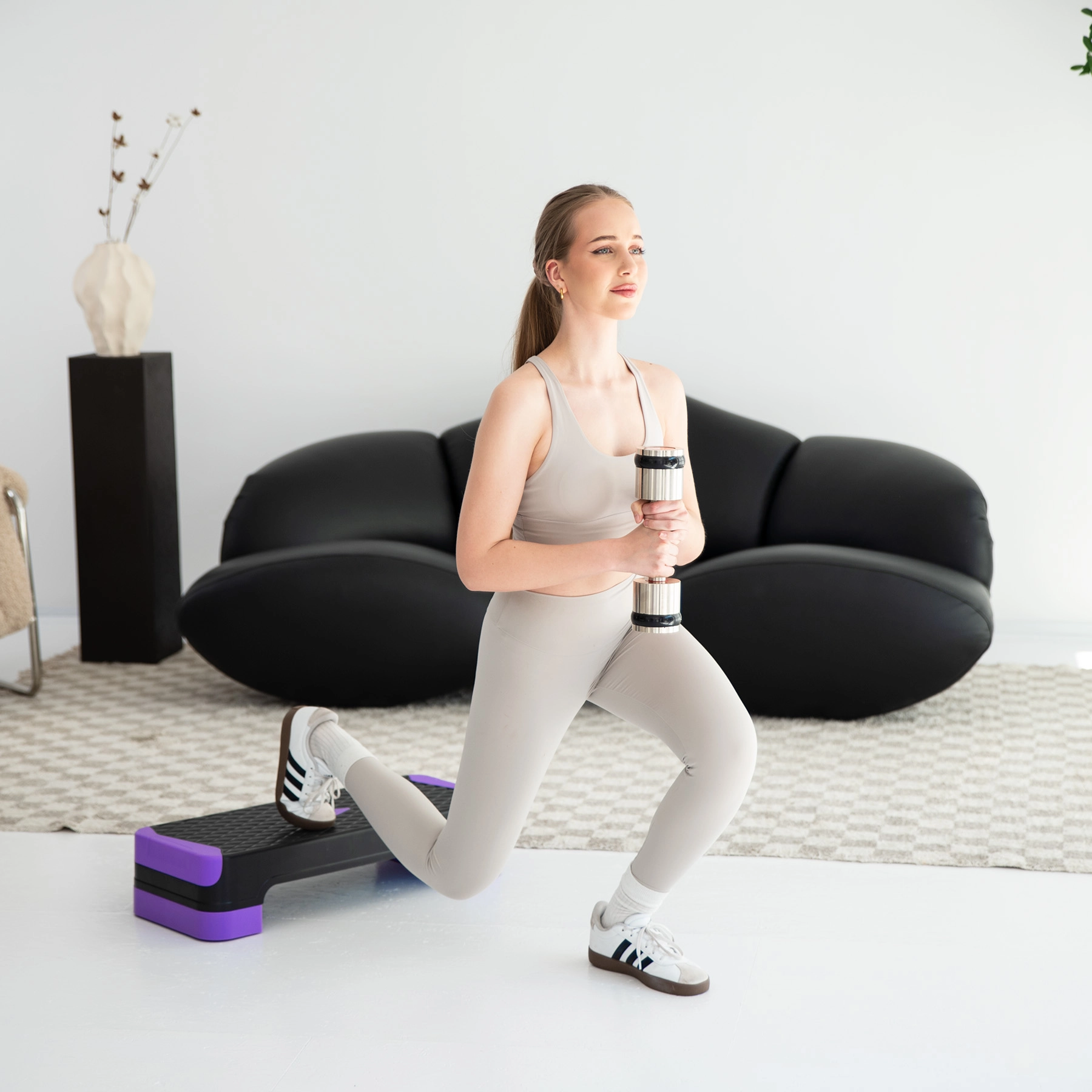 Het anti-slip oppervlak en de robuuste constructie zorgen voor zekerheid bij step-oefeningen, lunges en krachttraining met dumbbells in de thuisomgeving.