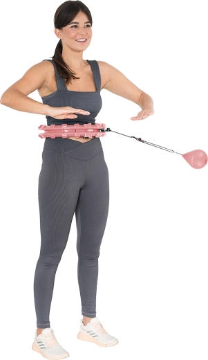 Het roterende gewicht van 400 g is bevestigd aan een verstelbaar koord (22–38 cm). Door de lengte te veranderen, pas je de trainingsintensiteit aan – hoe langer het koord, hoe hoger de centrifugaalkracht en de moeilijkheidsgraad. De binnenzijde van de ring is uitgerust met verende massageknoppen die schokken dempen en tegelijkertijd de taille prettig masseren.