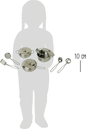 Kook als een professional! Deze set metalen kinderservies is precies ontworpen voor kleine handjes en tovert elke kinderkeuken om tot een plek vol creatieve pret. Bevat potten met deksels, een pan, een soeplepel en andere serveergereedschappen. Stimuleert fantasie, rollenspel, de ontwikkeling van sociale vaardigheden en fijne motoriek.