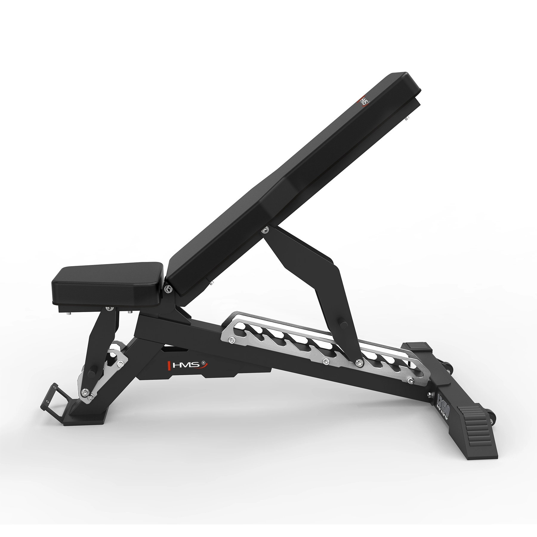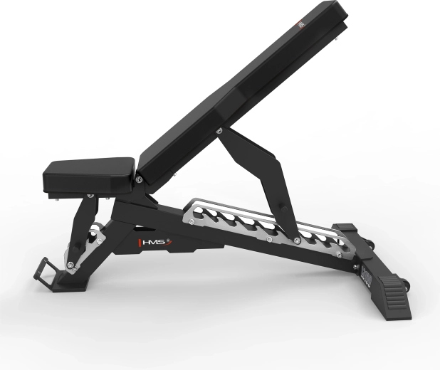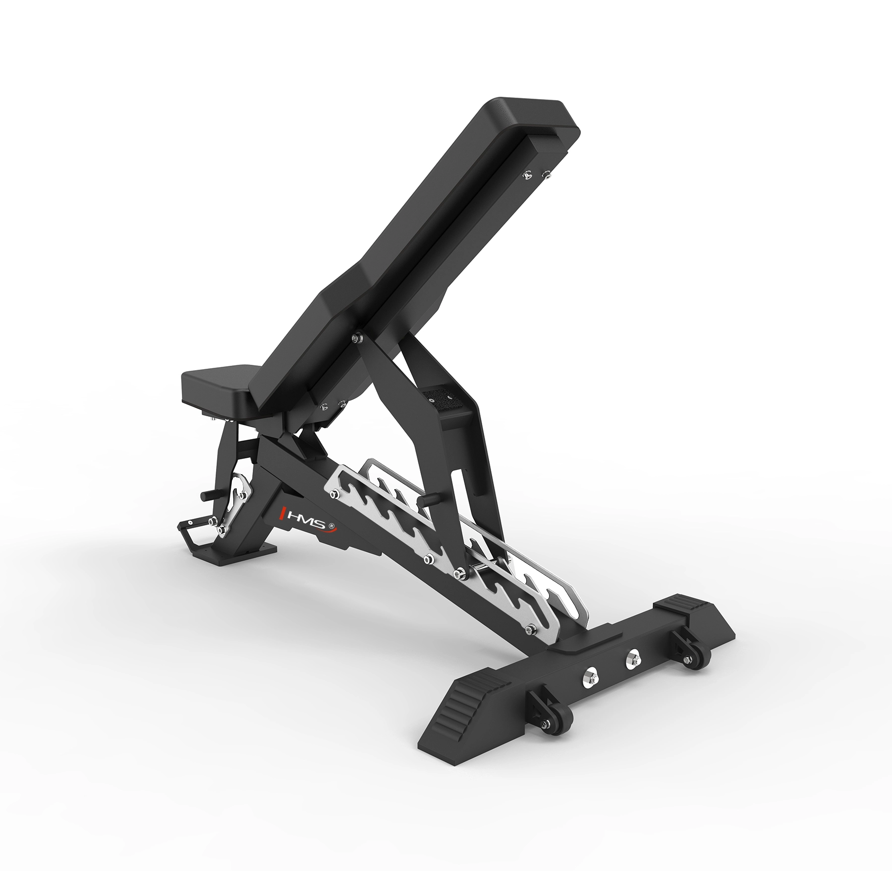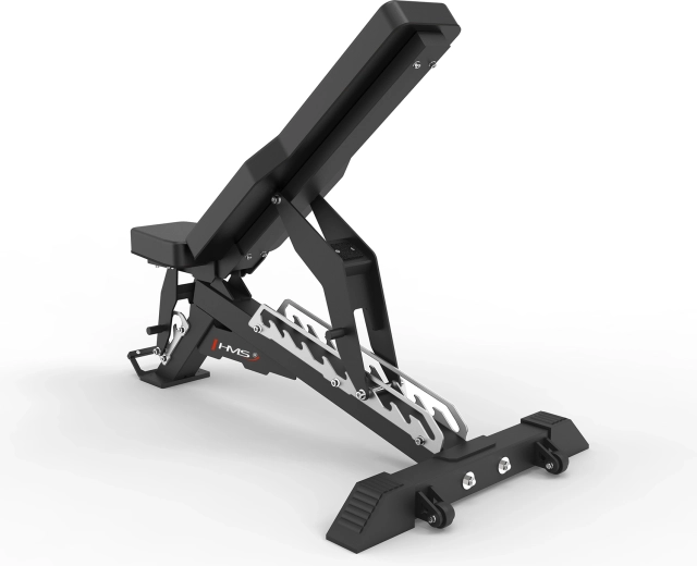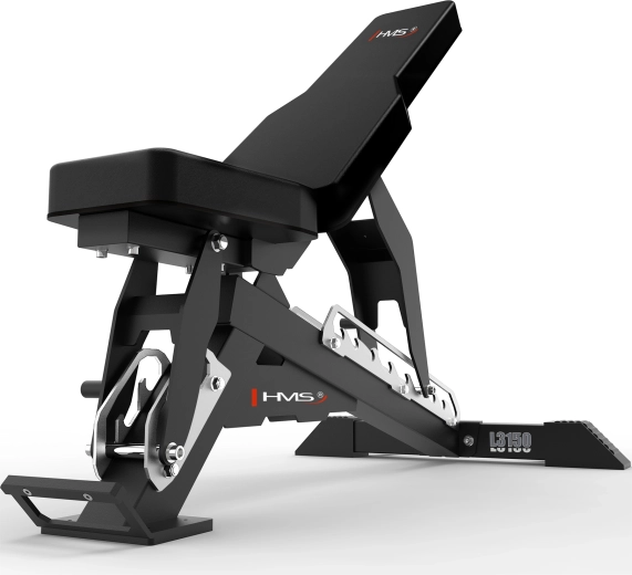 De HMS L3150 is een premium, variabele bank ontworpen voor commercieel gebruik en veeleisend thuisgebruik. Dankzij de precieze verstelling van de rugleuning (0–90°) en de zitting (0–30°) dekt hij een reeks oefeningen van vlakke, schuine en negatieve bankdrukken tot dumbbell-oefeningen en seated press. Verchroomde, laser-gesneden vertandingen maken zekere en snelle vergrendelingen mogelijk, terwijl de dubbele frameversteviging maximale stijfheid en veiligheid biedt.