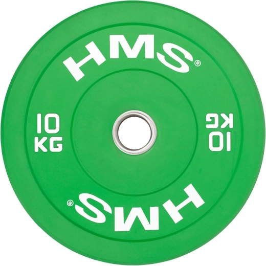 Duurzame gekleurde bumper schijf HMS 10 kg voor gewichtheffen en functionele training. Standaard diameter 450 mm, opening 50/51 mm voor olympische halterstangen en rubberen uitvoering voor minder stuiteren en bescherming van de vloer. Duidelijke gewichtsaanduiding en een centraal inzetstuk van roestvrij staal beschermt de stang tegen krassen.