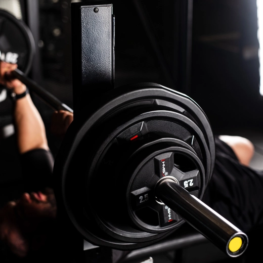 De schijf past op standaard olympische stangen en machines, zodat je de belasting eenvoudig kunt verhogen bij squats, presses en bankdrukken.