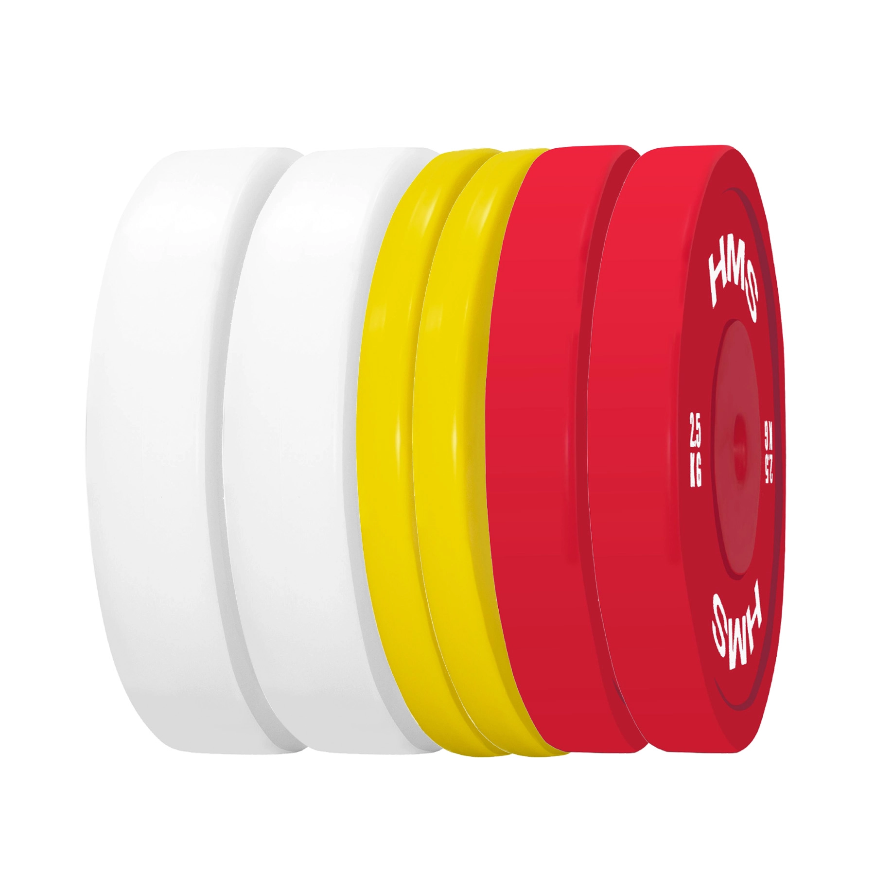 De set bevat drie paren schijven met gewichten van 1,5 kg (geel), 2,5 kg (rood) en 5 kg (wit), zodat je de belasting eenvoudig kunt aanpassen aan niveau en trainingsdoel. De polyethyleenconstructie is vochtbestendig, roest niet en is vriendelijk voor de vloer, terwijl het gladde oppervlak makkelijk te reinigen is en langdurig mooi blijft.