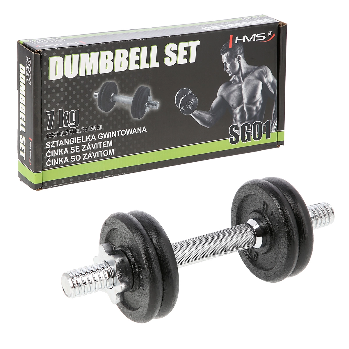In de verpakking zitten gietijzeren schijven van 1 kg en 1,25 kg, waarmee je het totale gewicht van de halter eenvoudig tot 7 kg kunt instellen. De set is compact, duurzaam en geschikt voor thuisgebruik of als aanvulling op bestaande uitrusting.