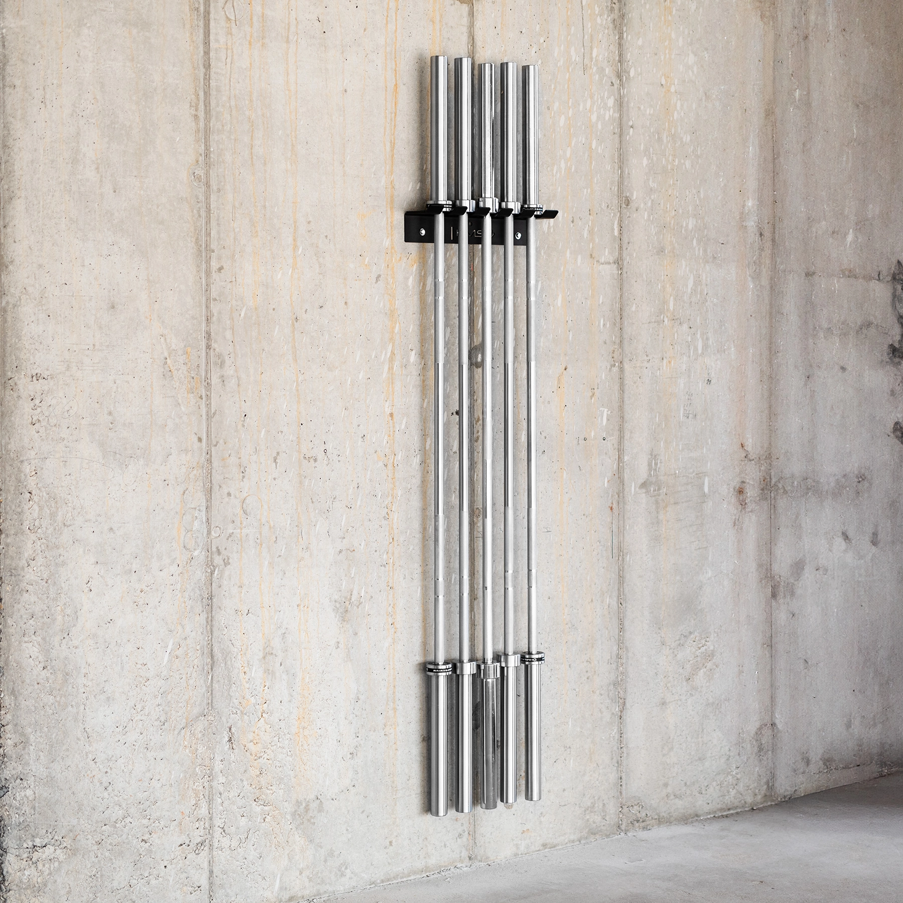 Verticale opslag van tot 5 olympische stangen naast elkaar maakt waardevolle vloerruimte vrij en houdt je gym overzichtelijk.