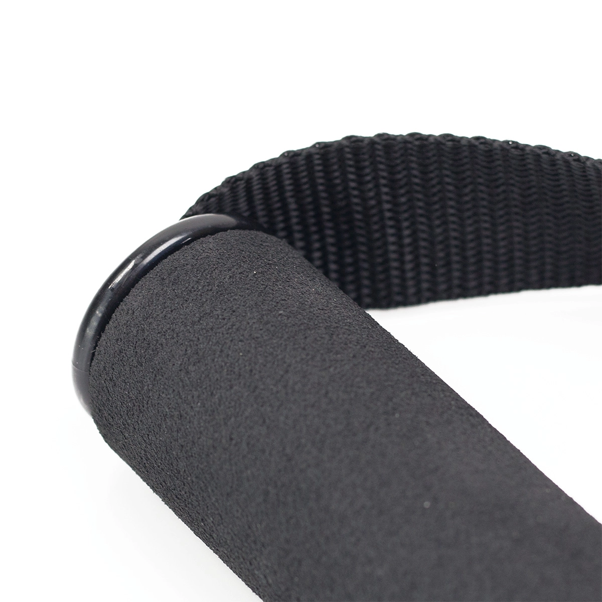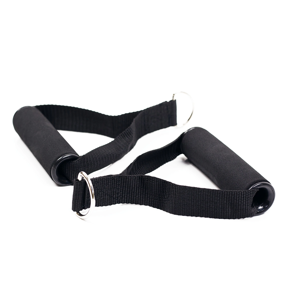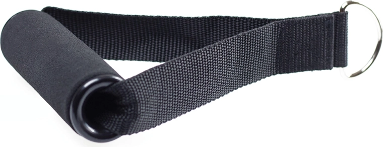 Stevige nylon band en metalen ringen zorgen voor een veilige aansluiting op weerstandsbanden of katrollen.