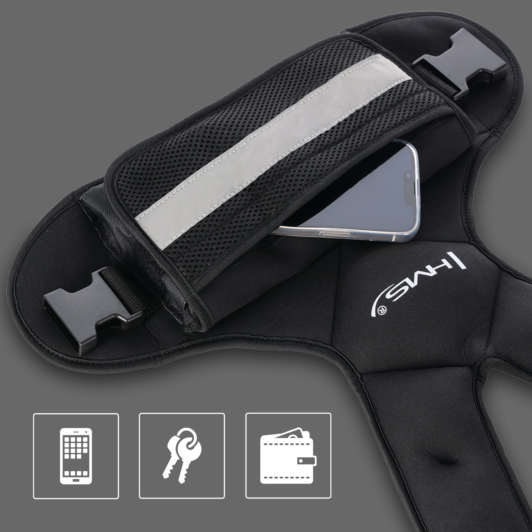 Het neopreen materiaal voelt zacht aan, is zweetbestendig en helpt het vest op zijn plaats te blijven, zelfs bij intensieve beweging. Verstelbare zijbanden zorgen voor een zekere en individuele pasvorm. Een praktische meshzak biedt ruimte voor je telefoon of sleutels en reflecterende elementen verhogen de veiligheid tijdens buitentraining bij beperkte zichtbaarheid.