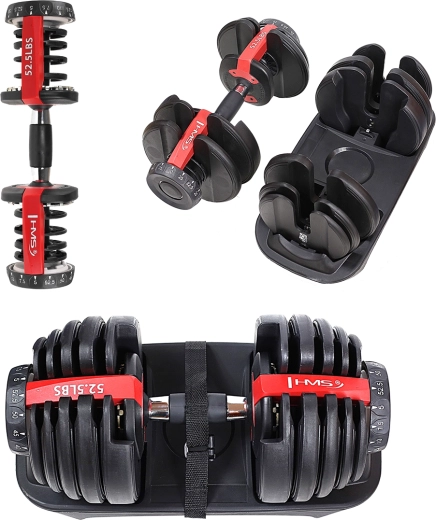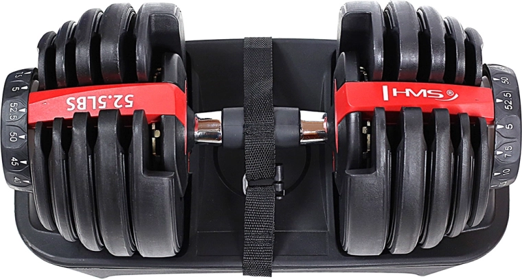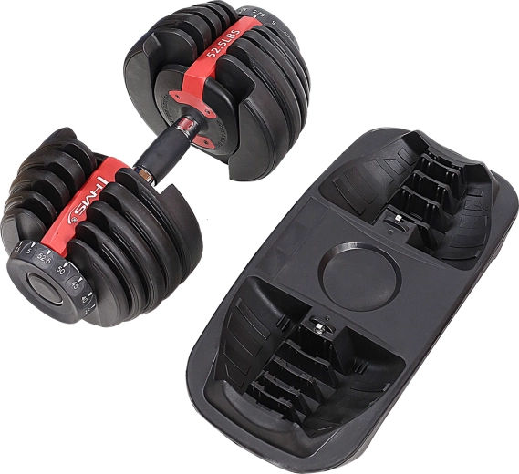 Deze compacte verstelbare halter biedt een traploze gewichtsinstelling van 5 tot 52,5 lbs (2,5–24 kg), zodat je de belasting eenvoudig aanpast aan elke oefening en elk niveau. Het innovatieve mechanisme met zijregelaars laat je het gewicht in seconden wijzigen zonder omslachtig wisselen van schijven.